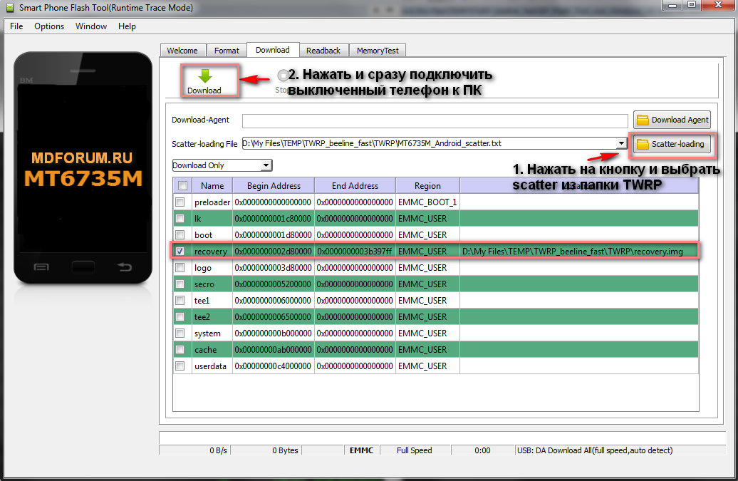 1. Скачиваешь архив TWRP_beeline_fast.rar из вложения к посту, распаковываешь. 2. Устанавливаешь драйвера из этого архива MTK_USB_All_1.0.2.zip 3. Помещаешь архив unlock.zip из папки TWRP_beeline_fast на карту памяти. 4. Выключаешь смартфон. 5. Запускаешь SP Flash Tool (flash_tool.exe) 6. Нажимаешь scatter-loading и выбираешь файл MT6735M_Android_scatter.txt из папки TWRP. 7. Нажимаешь кнопку Download и сразу подключаешь выключенный телефон. Прошьётся TWRP recovery.