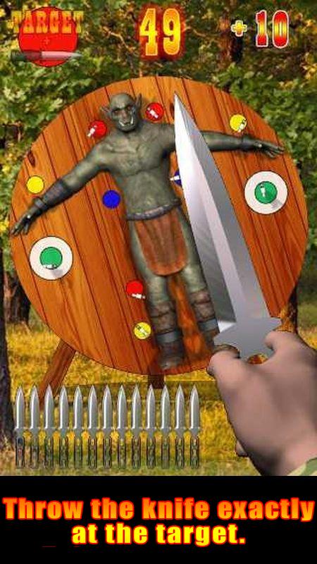 Прикоснитесь к экрану. Переместите палец так, чтобы кончик ножа переместился в место, куда вы хотите бросить нож. Уберите палец с экрана. Нож брошен.