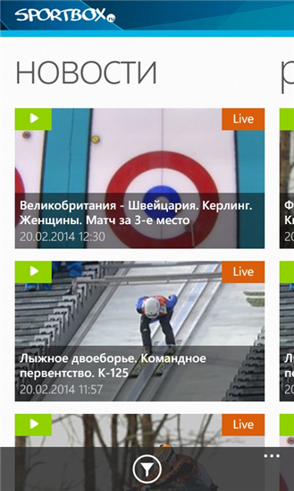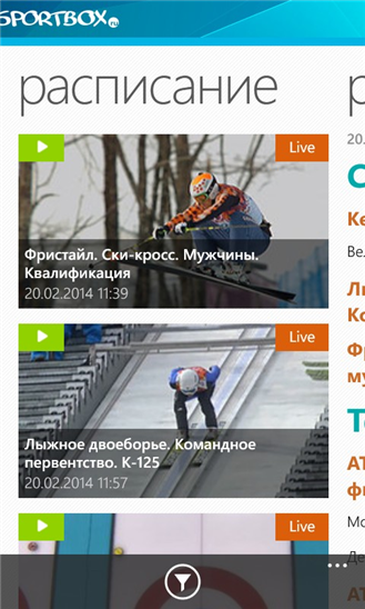 Приложение Sportbox.ru для Windows Phone – это самые интересные события в мире спорта! С приложением Sportbox.ru вы всегда будете в курсе последних спортивных новостей, сможете смотреть прямые LIVE-трансляции и следить за спортивной статистикой. Всегда актуальное расписание будет держать вас в курсе предстоящих видео трансляций. А для тех, кто не смог посмотреть трансляцию в живую или желает пересмотреть ее еще раз, Sportbox.ru предлагает доступ к крупнейшему спортивному видео архиву!