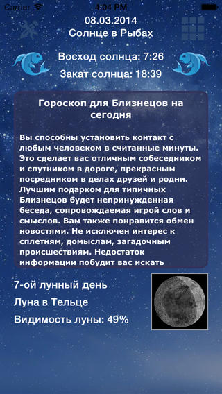 Ежедневные гороскопы на день, на завтра, на неделю, на месяц и на год. Несколько источников данных. А так же подробная информация о фазах луны. Информация о восходах и закатах солнца. Всё то, что необходимо каждый день.