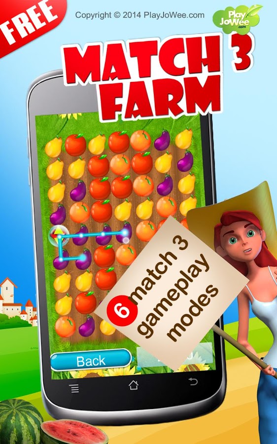 Одна из самых интересных и сложных матч 3 головоломок для вашего телефона. Великолепная графика, музыкальное оформление создадут неповторимую атмосферу сбора урожая на вашей ферме. Новые функции, такие как подбор фруктов, бонусы и "бомбы" сделают классический игровой процесс игр жанра 3 в ряд еще интереснее.
