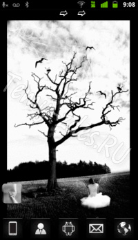 Депрессивная тема для Android сделанная с использованием 2 цветов: чёрного и белого, на которой изображена девушка сидящая перед засохшим деревом.