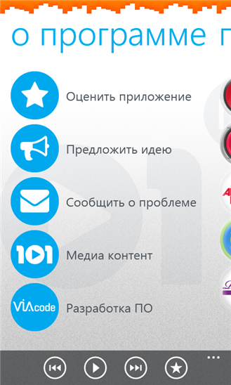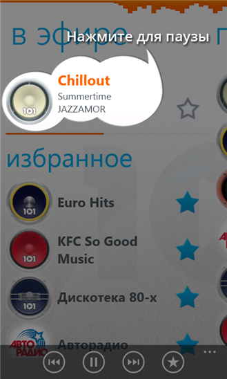 Официальный Windows Phone клиент для прослушивания радиостанций портала «101.Ru». Портал «101.Ru» это почти 200 музыкальных каналов всех стилей и направлений: от Авторадио до Радио ENERGY, от джаза до хип-хопа, от Дискотеки 80-х до тяжелого рока.