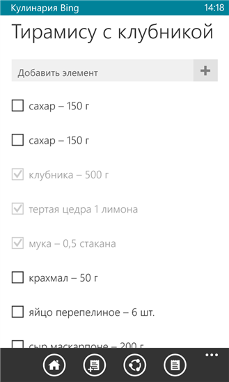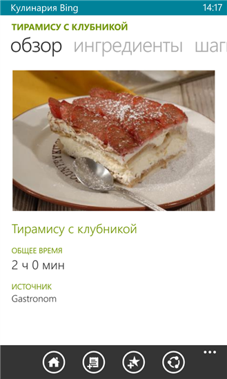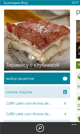 Приложение "Кулинария Bing" делает проще поиск рецептов, а также выбор вина и коктейлей; вы легко узнаете, как сделать следующий обед незабываемым. Вам понравятся красивые фотографии, простые инструкции и удобные средства, такие как список покупок и коллекции. Держите свой список покупок синхронизированным на всех устройствах. Делитесь своими рецептами, списком покупок или коллекциями с семьей и друзьями. Приложение "Кулинария Bing" — важный компаньон для вашей кухни.