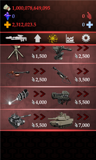 Захватывающая игра, которая затянет на много-много часов. Не отвлекайся, не останавливайся, набирай очки, стань оружейным бароном. Простая игра, смысл которой заключается в накоплении, как можно большего количества очков(денег), путём нажатия на центральную панель и покупок различного вида оружия и улучшений, что приведёт к увеличению дохода.
