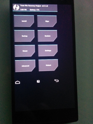 9. Как только процесс завершится, отключите телефон от компьютера, зажмите кнопки: "звук вниз" + "питание", как только вы почувствуете вибрацию кнопки можно отпустить. Вы попадёте в рекавери: