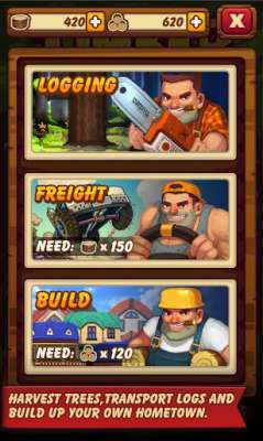 Timber story - работа лесоруба опасна и трудна. Помогите им срубить как можно больше деревьев и постройте целый городок, где лесорубы смогут отдохнуть от тяжелой работы. Отправляйтесь на лесозаготовку и рубите деревья в этой игре для Андроид. Рубите деревья так быстро, как это возможно. Транспортируйте древесину с помощью специальной техники. Изготавливайте из бревен стройматериалы и постройте из них город для работников. Развивайте Ваш городок и стройте все более совершенные здания. Берите свой топор и докажите, что Вы являетесь лучшим лесорубом в этом городе!