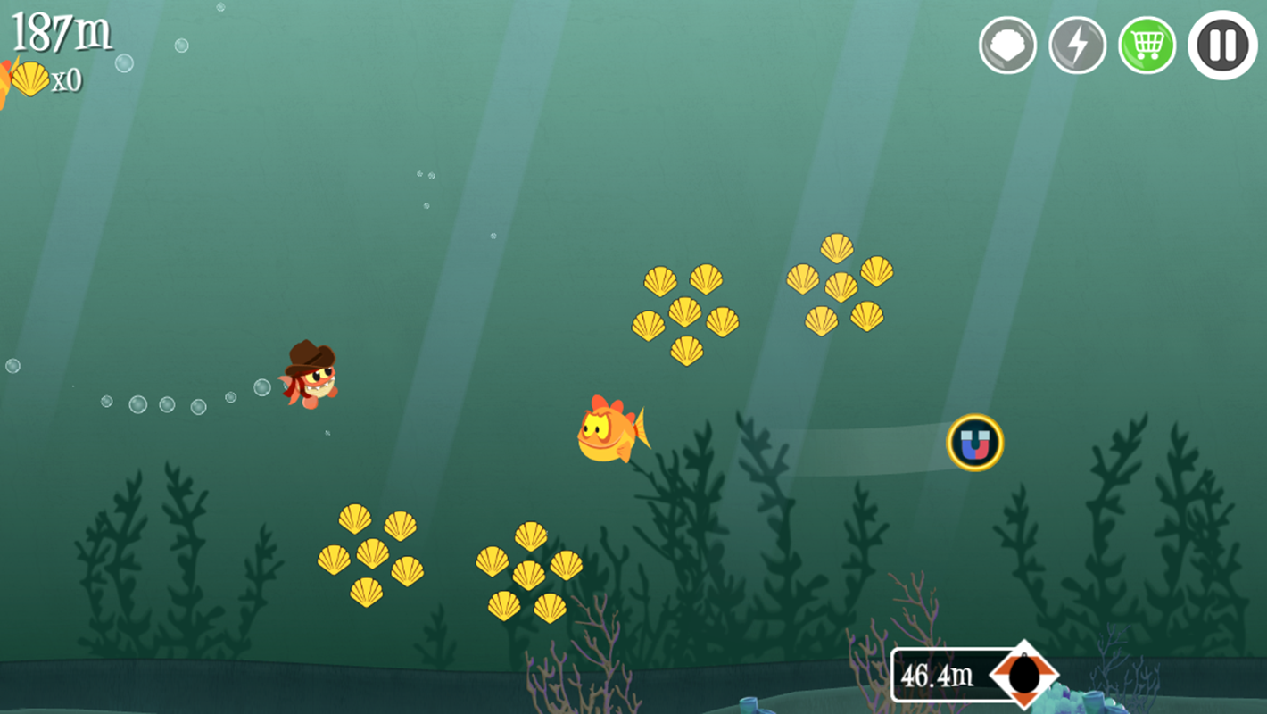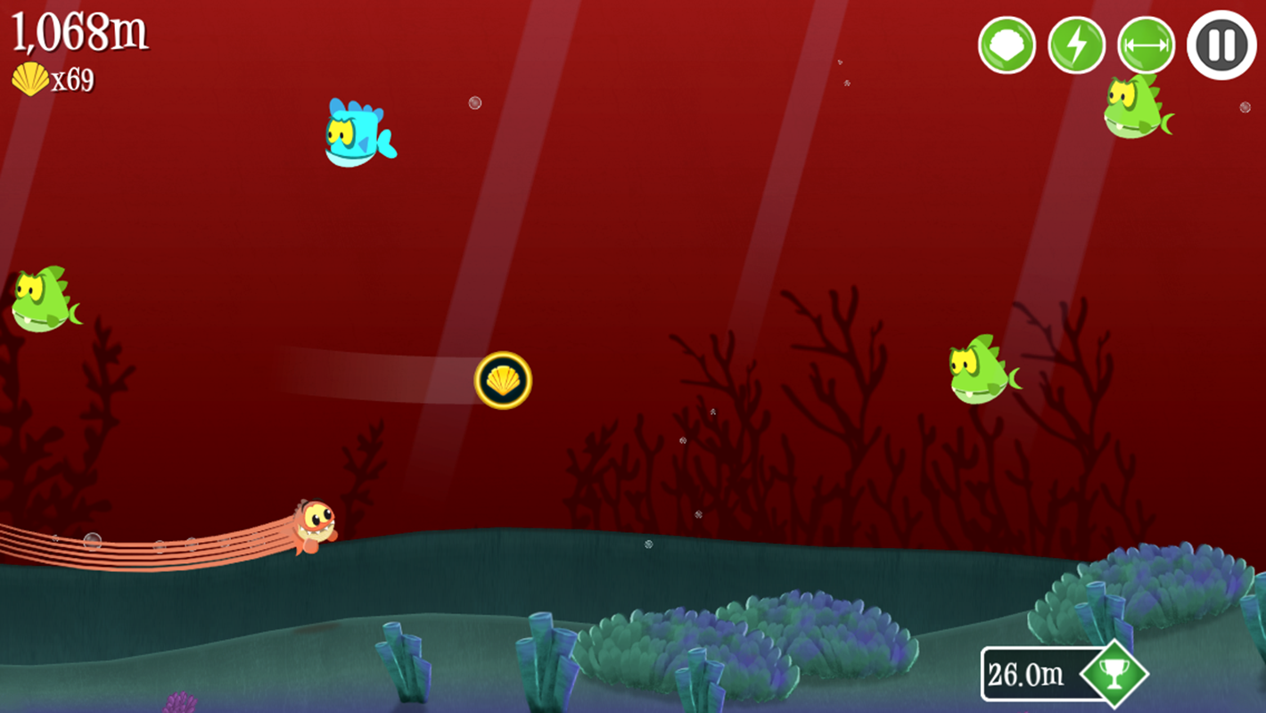 Вам предстоит убегать маленькой рыбкой от акулы. Плывите из-за всех сил, собирайте бонусы, скользите на воде, ныряйте, вообще делайте всё возможное чтобы вас не съели. Собираем моллюсков, с помощью которых в конце каждого уровня можно покупать различные апгрейды для вашей рыбки. В игре более 60 уровней, как долго вы сможете проплыть?