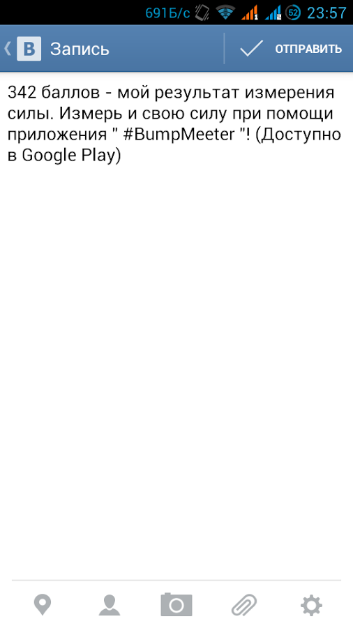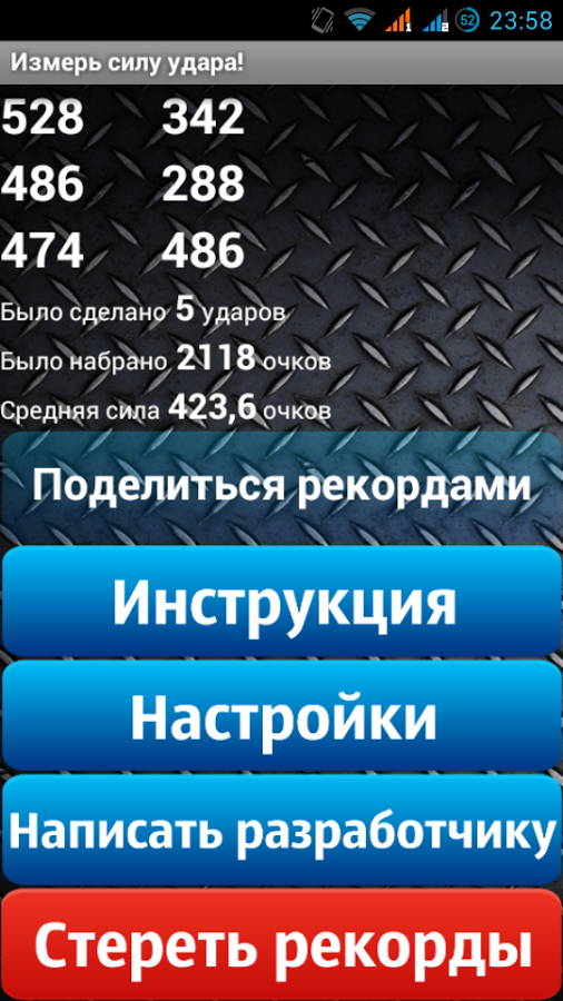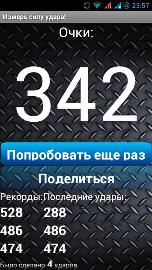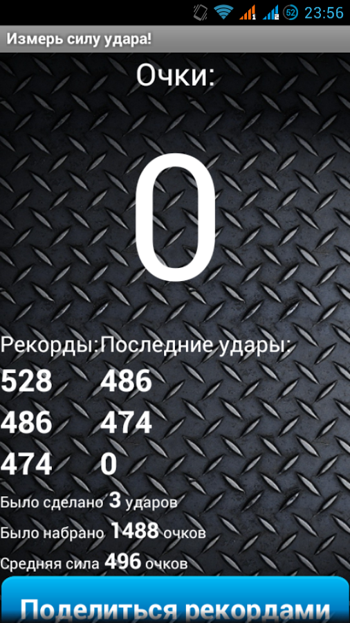Хочешь узнать насколько ты силен и резок? Тогда приложение "BumpMeeter" для тебя! Для проверки силы удара сожми телефон в руке, а затем резко ударь в воздухе. Приложение оценит твой удар благодаря встроенному в большинство смартфонов датчику ускорения, и выдаст результат в очках. Ты можешь поделиться своим результатом с друзьями в социальных сетях, либо соревноваться с ними. Тренируй силу удара когда-угодно и где-угодно, даже там, где рядом нет спортзала: дома, в машине, на даче, или просто во время прогулок.
