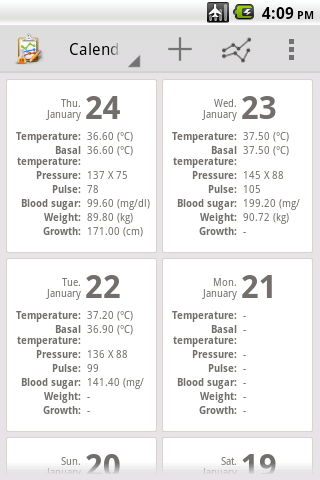 Приложение для контроля изменения основных показателей человеческого тела, таких как общая температура, базальная температура тела, давление, пульс, уровень сахара в крови, вес, рост. По накоплению показателей предоставляется возможность построения графиков динамики изменения для каждого показателя. Есть возможность хранения основных лабораторных анализов — анализов крови и мочи, при добавлении которых предоставляется стандартизированная форма ввода показателей и граничных предельных результатов по каждому показателю для выбранного анализа.