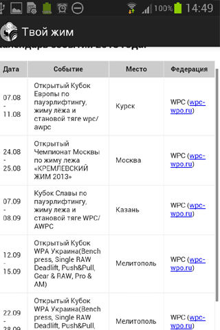 - Встроен календарь соревнований по пауэрлифтингу и жиму лежа.