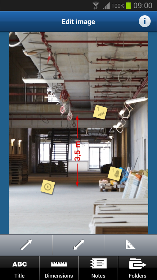 - Измерительная камера: Указание результатов измерения (длина, угол и т.д.) непосредственно на фотографии; Обозначение особенностей (электропроводка, коммуникации, вентиляция и т.д.) и добавление примечаний (устные комментарии, текст, видео); Приложение проектов и распоряжений к ним; Отправка по электронной почте