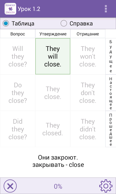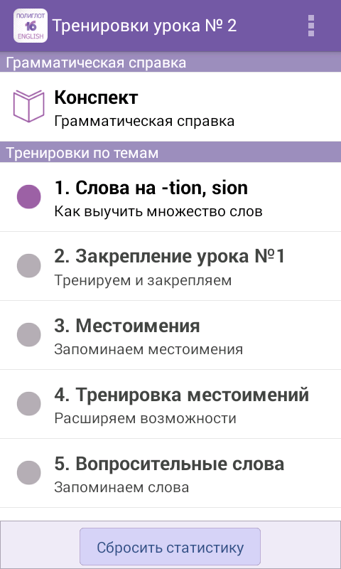- Встроенное описание грамматики к каждой тренировке, к каждому предложению