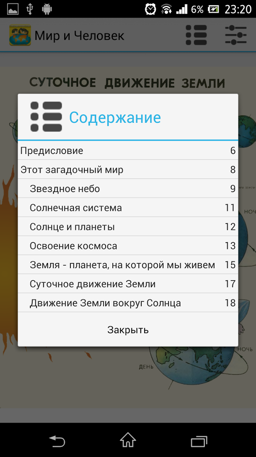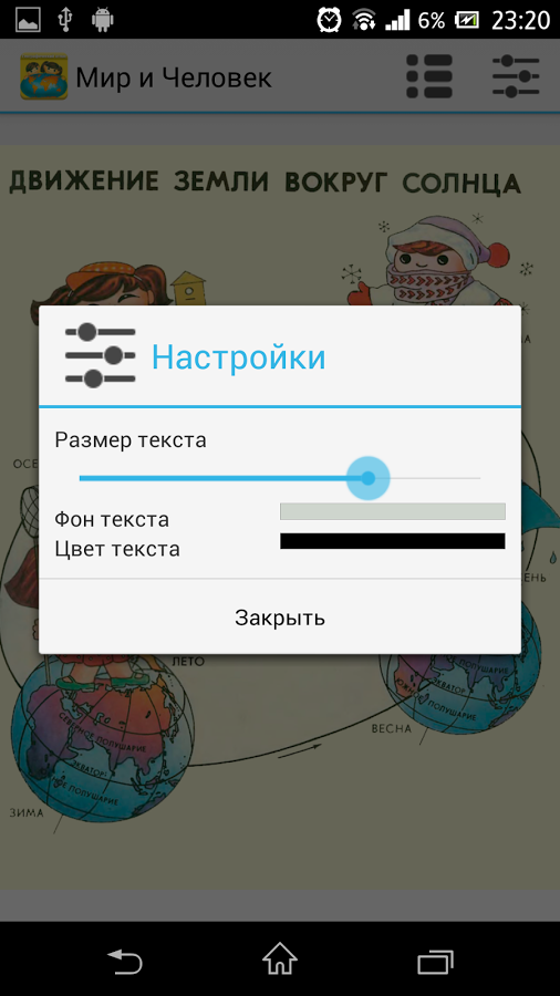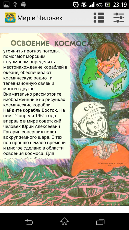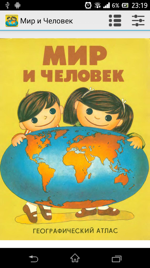 Всем знакомый с детства атлас "Мир и человек". Есть возможность настраивать размер/цвет текста, а также цвет фона. Реализована возможность изменять размер текста жестом (pinch to zoom). На данный момент реализована первая глава - "Этот загадочный мир". Следите за обновлениями.