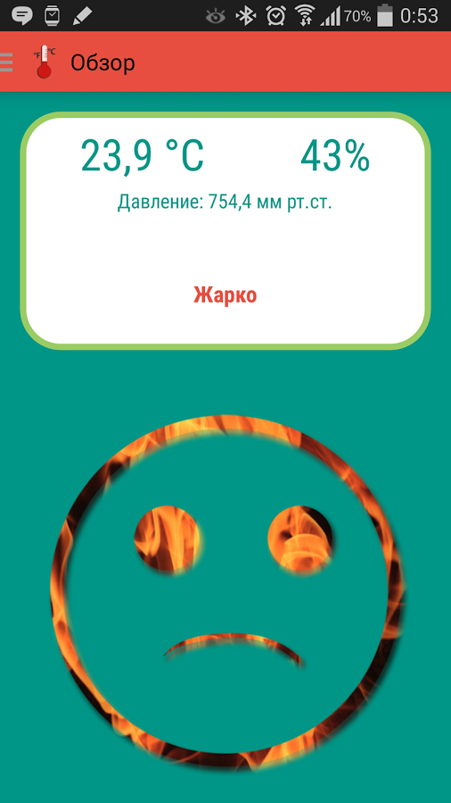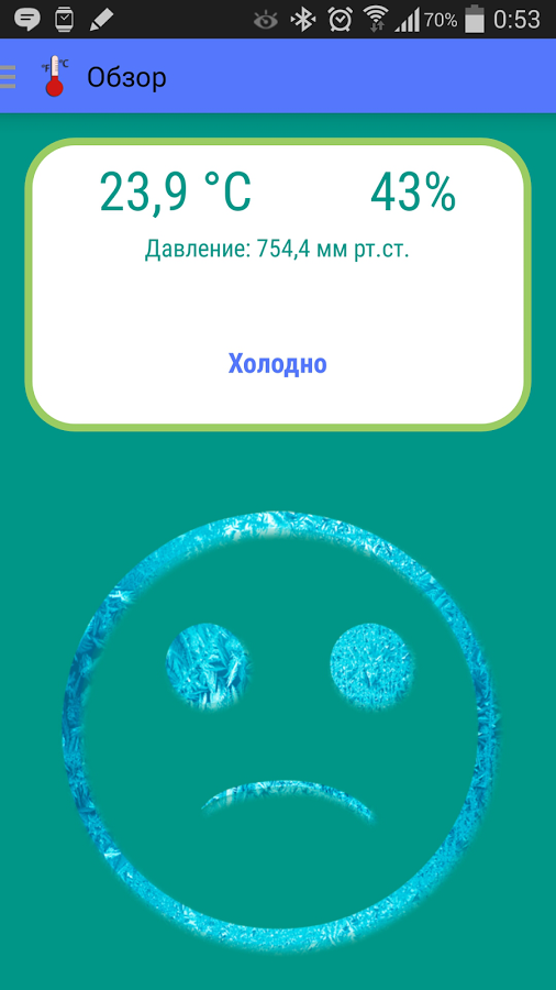Простая программка для просмотра температуры, атмосферного давления и влажности используя датчики устройства.
