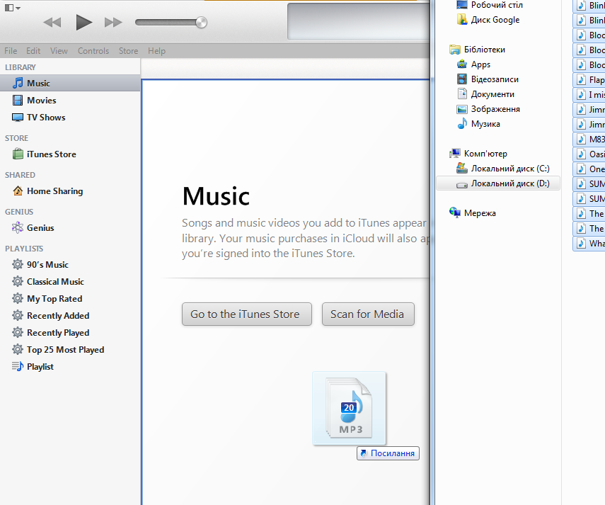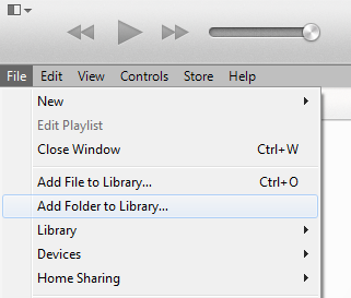 После того как iTunes установлен, откройте главное окно программы и в левом верхнем углу выберите File ---> Add folder to library. Появится окно обзора, через которое найдите папку с вашей музыкой нажмите на нее мышкой один раз и нажмите кнопку Выбор папки. Все треки добавлены к вам на iTunes. Вы также можете перетащить все выделенные треки в главное окно iTunes.