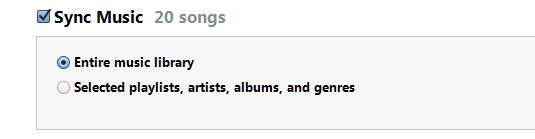 5. Теперь вам предоставлен выбор скопировать ли всю библиотеку музыки Entire Music Library или выбранного артиста, альбом, жанры или плейлисты Selected playlist, artists, albums, and genres. Убедитесь что на вашем iPod достаточно места для выбранной вами музыки.