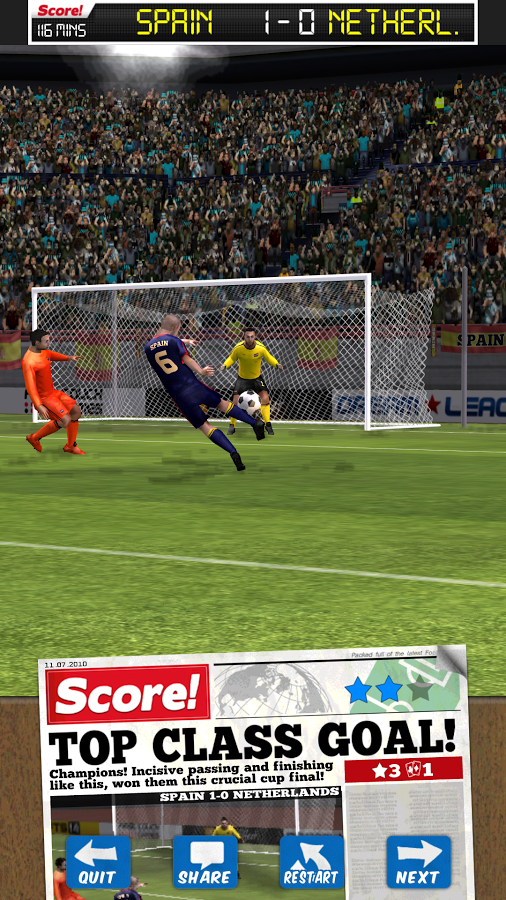 Score! World Goals - футбольный симулятор, который позволит Вам еще раз забить самые легендарные голы из известных матчей. Окунитесь в историю футбола, еще раз пересмотрите самые значимые футбольные поединки. В игре реализована качественная реалистичная физика и приятная графика.