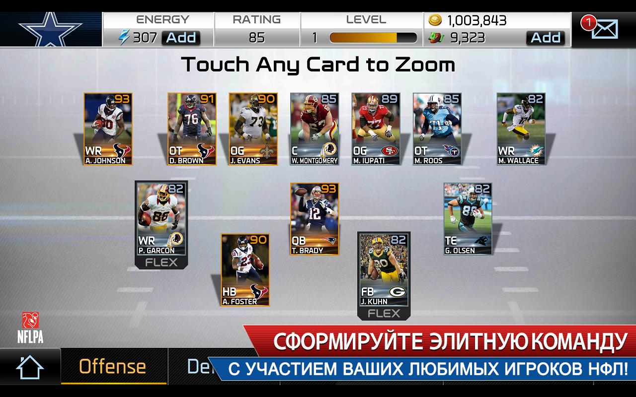 Собирайте своих любимых игроков NFL, получая их в специальных наборах или на аукционе, формируйте свою собственную идеальную непобедимую команду, а затем громите друзей на футбольном поле.