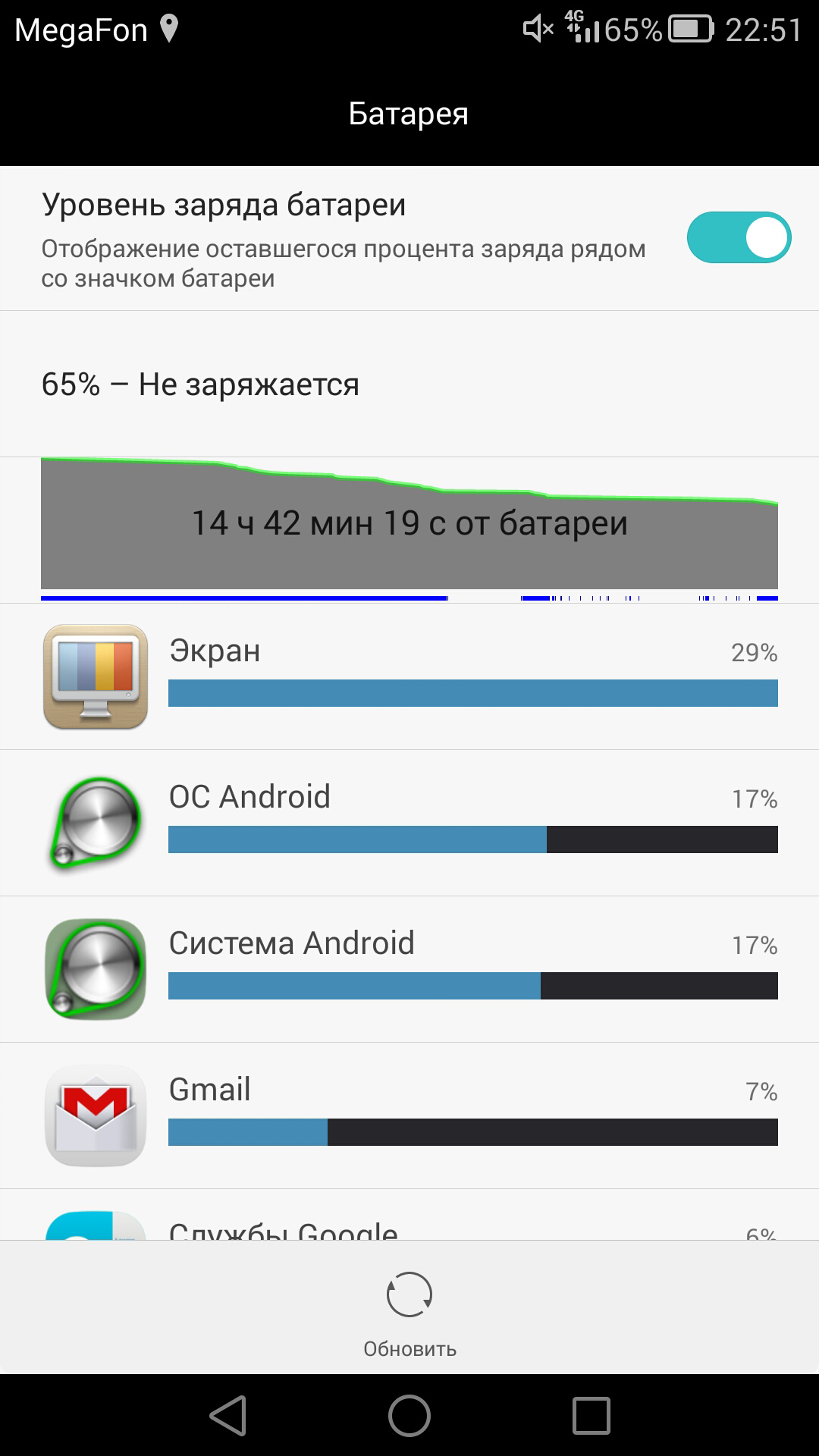 Автономности у Huawei Ascend Mate7 — завались. Если им активно пользоваться как телефоном, довольно часто проверять почту и серфить, то к концу дня остается около 50% заряда. В нашем случае, после довольно серьезных нагрузок смартфон смог разрядиться на 35% почти за 15 часов.