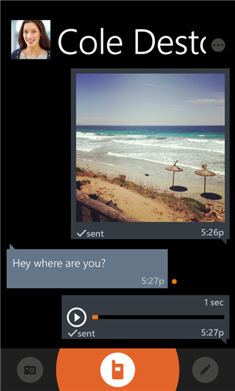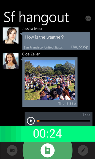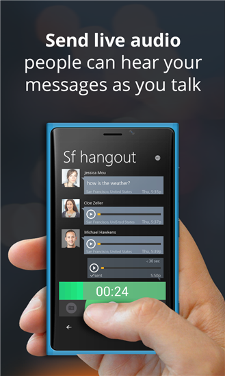 Приложение для общения на windows phone, позволяющее вам легко и мгновенно общаться друг с другом или группой друзей. Друзья могут слушать ваши сообщения во время разговора или записать из и прослушать позже. Вы также можете отправить текст, фотографии, и даже поделиться своим местоположением.