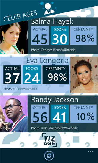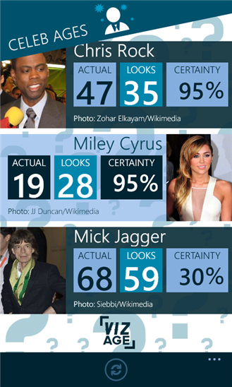 Приложение для windows phone, с помощью которого вы сможете легко определить возраст любого человека. Сфотографировав лицо человека приложение попытается угадать возраст, а также вы сможете посмотреть возраст своего любимого актера, телеведущего и музыкантов в базе данных где хранятся более 300 известных лиц.
