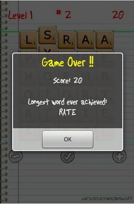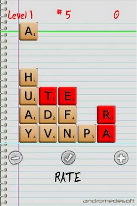 Основная цель игры является правильное построение слов из букв. Но вы должны поторопиться, потому что время идёт и экран заполняется в зависимости от уровня. Существуют 5 уровней ( 7 уровней в pro версии) Tour easy и difficut, demolitio easy и difficout (multiplayer, killer easy, difficout в pro версии). В уровне tour основная цель является собрать нужное количество слов, но торопитесь кубики с буквами идут и идут и экран постепенно заполняется. В уровне Demolition основная цель является это за определённое время уничтожить кубики с грустными рожицами, когда вы собираете слова они идут всё ниже и ниже, рекомендую сразу под рожицами собирать слова, чтобы быстрее перейти на следующий уровень. Killer (в pro версии) похожи на tour, но есть отличия.