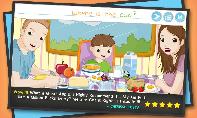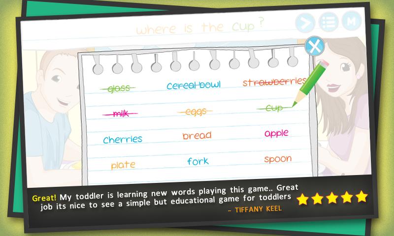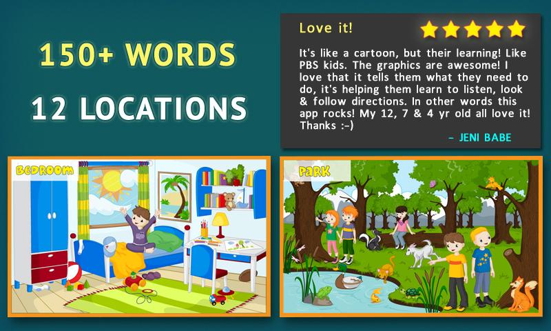 Игра в которой ваш ребенок будет учить английский язык в игровой форме. Во время игры он посетит повседневные места такие как дом, школа, город и парк в которых все предметы написаны на английском языке, таким образом ребенок быстрее будет запоминать название предметов. В игре несколько режимов и один из них режим воспроизведения слов на английском, в котором он будет слышать правильное произношение и звучание. Интересная и полезная игра с красивой графикой и большим архивом слов.