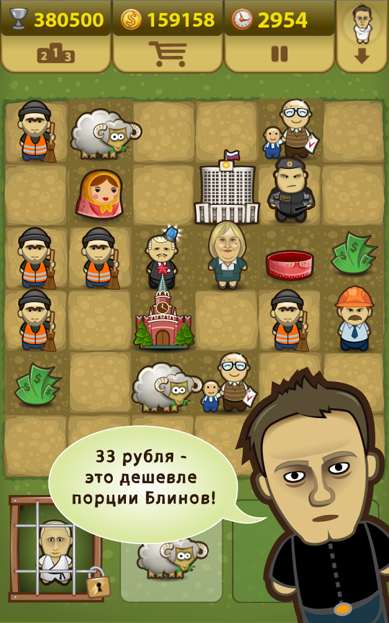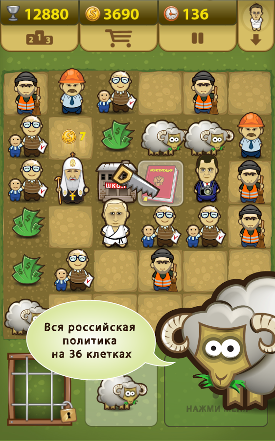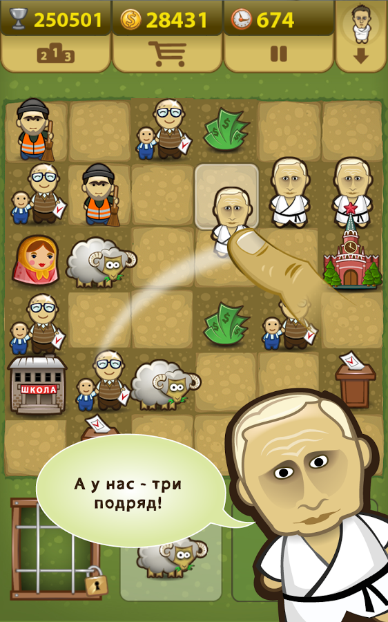 Цель игры проста. Расставляя фигурки по полю 6х6 клеток, ты будешь наблюдать за их «карьерным ростом». Три и более одинаковых фигурки, поставленные рядом, превратятся в одну рангом выше: Министры образуют Правительство, Депутаты – Думу, и так далее. Твоя задача - продержаться на политической арене дольше всех. Даже кресла Премьера или Президента не являются в этой игре конечными целями — ДЕМОКРАТИЯ позволит тебе устроиться ещё круче! Пила в твоих руках!