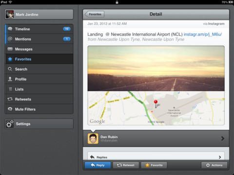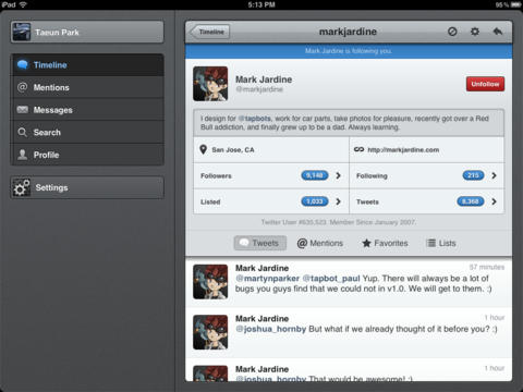 Tweetbot - это полнофункциональный twitter клиент для iPad с множеством возможностей. Он включает и тщательно продуманный интерфейс, звуки, анимацию и несколько особых функций, например ленты и множество жестов.
