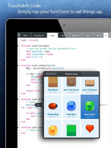 Codea позволяет создавать целые приложения на основе программного языка Lua. Этот язык, чем-то похожий на javascript, предоставляет простые и в тоже время функциональные инструменты для работы именно на планшете iPad. В нем реализованы методы обработки событий тачскрина, акселерометра и другие особенности устройства. Код пишется очень просто еще благодаря продуманному визуальному редактору. Легко добавляются необходимые изображения, редактируется шрифт и цветовая палитра.