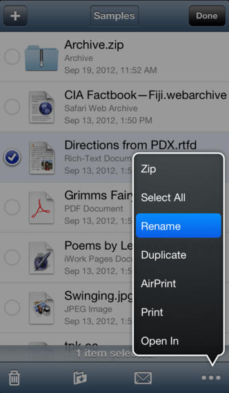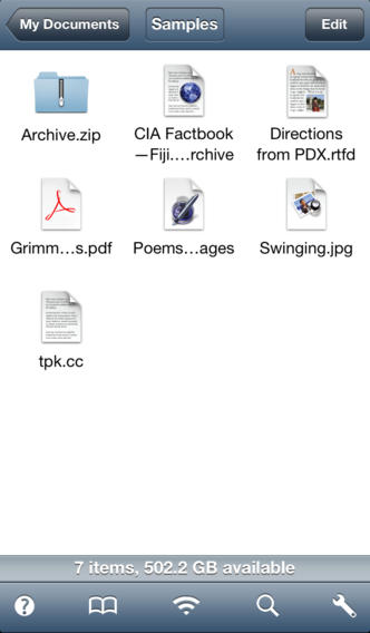 Приложение Air Sharing позволяет подключать iPhone к компьютеру и использовать его как сменный носитель — копировать документы (drag&drop) и просматривать их на iPhone. Форматы документов, которые можно просматривать на iPhone встроенным просмотрщиком: iWork (Pages, Numbers и Keynotes), MS Office (Word, Excel и PowerPoint), Safari Web Archive, HTML, PDF, RTF, RTFD, TXT (поддержка Unicode), Source Code (C/C++, C#, Java, JavaScript, XML, Perl, shell, Ruby, Python и др), видео iPhone (H.264, 3GPP, MP4), аудио (MP3, AAC, AIFF, WAV, CAF) и фото (GIF, JPG, PNG, TIFF). Поддержка платформ: Mac, Windows, Linux (GNOME и KDE).