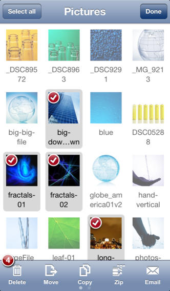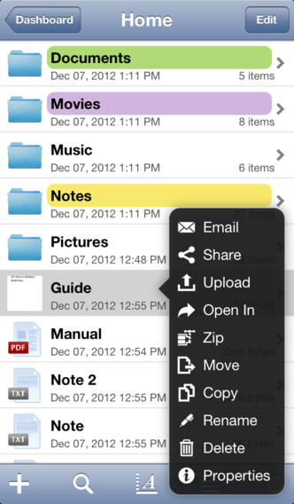 Вы можете посылать документы и файлы из iFiles по электронной почте. Нажмите и удерживайте файл/папку, чтобы показать всплывающее меню. iFiles имеет возможность создания и редактирования документов, а также умеет импортировать изображения.