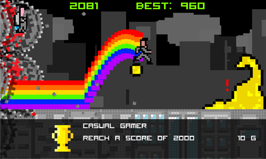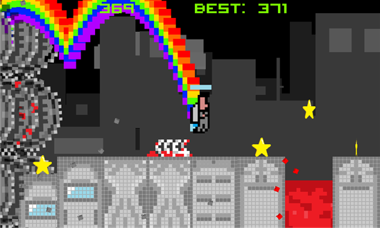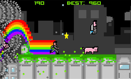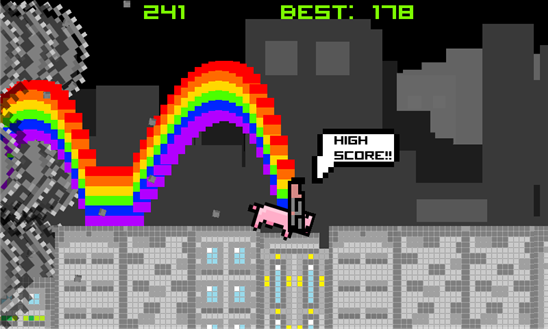 Собирайте на вашем пути улучшения, бонусы, а также выполняйте забавные действия, вроде отбрасывания свиней в пилу. На вашем экране постоянно будет масса забавных пиксельных эффектов, динамики будут издавать классную музыку, а сама игра не оставит вас равнодушными.