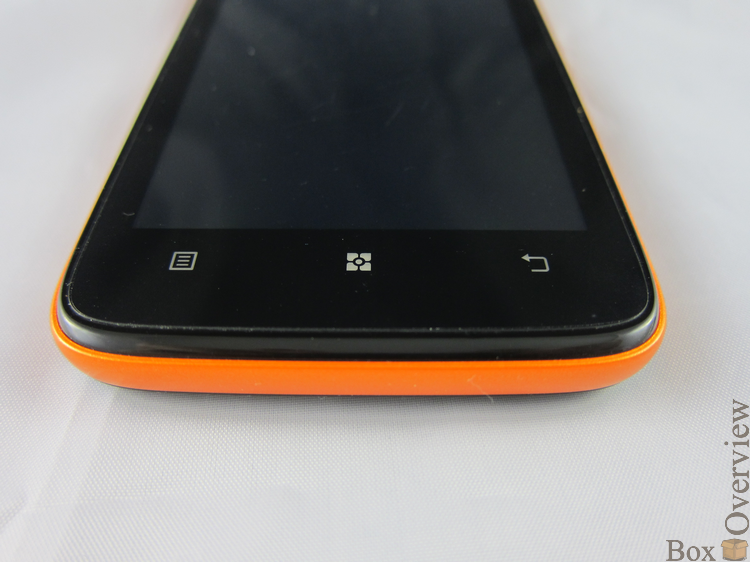 Спереди расположены 3 сенсорные кнопки с подсветкой: «Меню», «Домой» и «Назад».