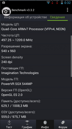 - Чип: Mediatek MT6589 (Cortex-A7 1.2GHz, 4 ядра)