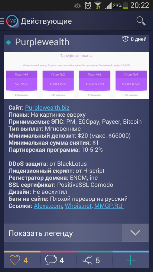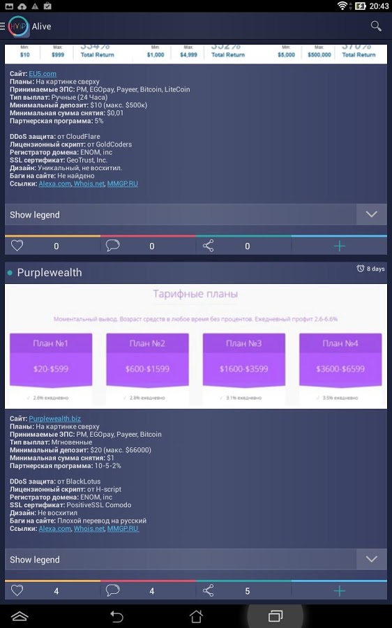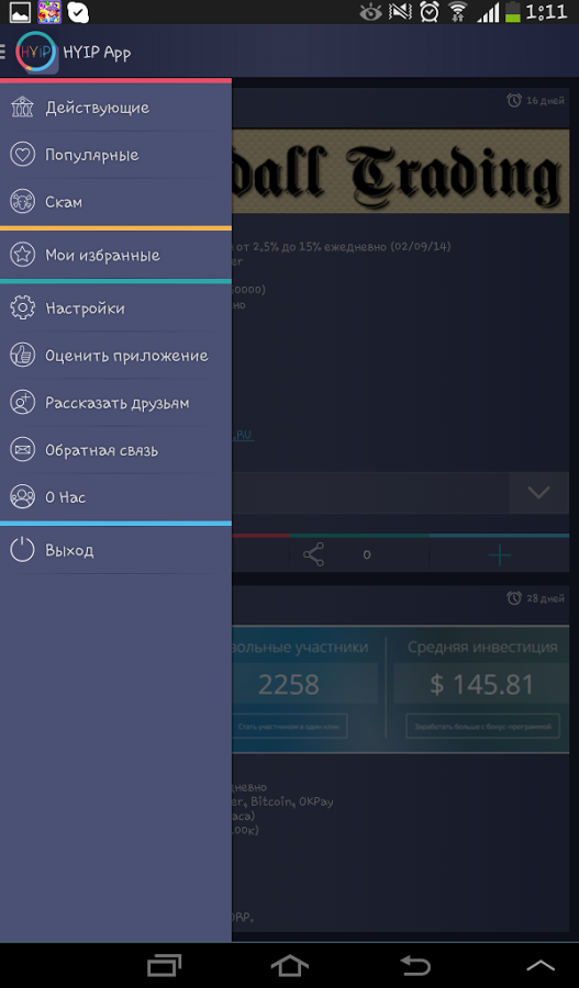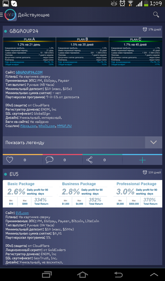 Предлагаем вашему вниманию приложение, которое предоставит вам возможность просмотра и получения описания инвестиционных проектов ХАЙП. С проектами можно будет не только ознакомится, но и отслеживать их. Приложение HYIP App имеет удобный интерфейс, простую навигацию и подборку новых актуальных инвестиционных проектов. Так же стоит отметить, что инвесторы получат практически всю важную информацию такую как: SSL, DDoS защита, минимальная сумма вывода, лицензия на скрипт, ссылки на Alexa и Whois для получения наиболее полной информации о домеине проекта и многое другое.
