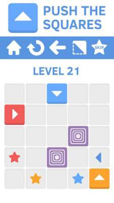 Рush The Squares - простенькая головоломка, которая поможет вам разогнать серое вещество разгадывая десятки различных головоломок. В игре сделан упор на анализ своих действий и логическое мышление. В самом начале игры вас ждет tutorial. Перед нами откроется поле из клеточек, на котором расположены звезды и такое же количество цветных квадратов. Передвигайте квадрат, что бы он перекрыл звезду иначе на другой уровень не перейти. Но квадрат двигается только по направлению стрелки нарисованной на нем. Вам предстоит толкать квадраты друг другом и использовать телепорты, иначе никак. Если вы не являетесь поклонником шашек и шахмат, то игра, скорее всего вам не понравится.