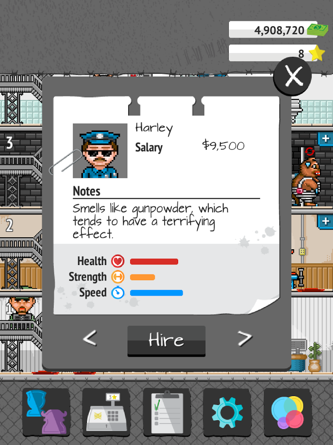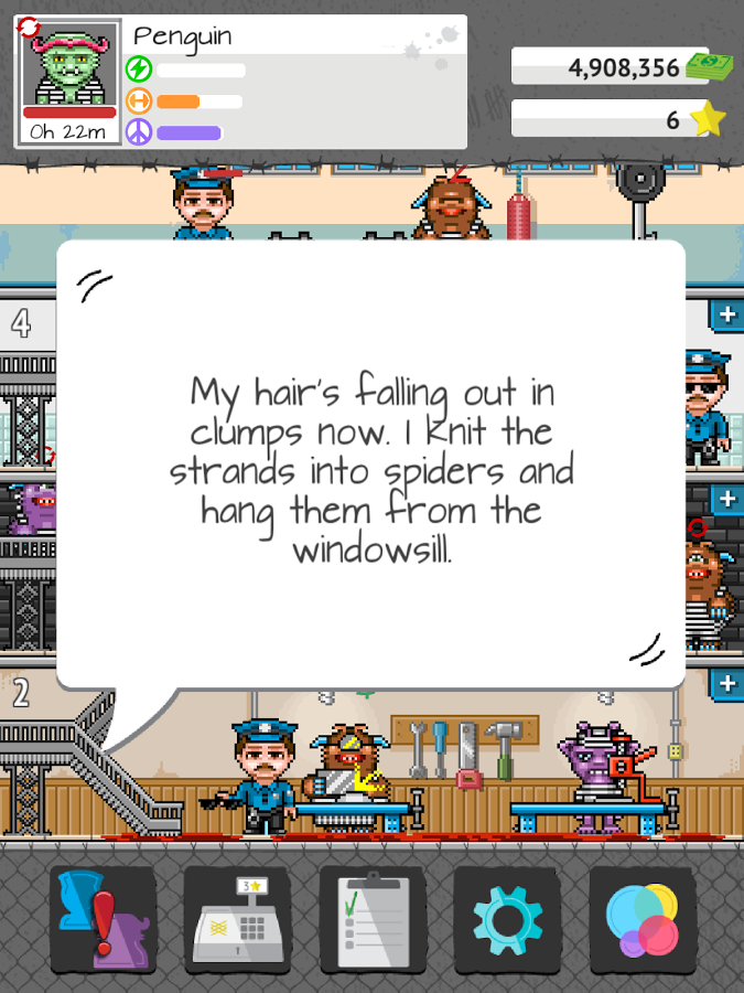 Вы возьмете на себя роль управляющего тюрьмой. Эта небольшая тюрьма, которую вам предстоит расширить и улучшить условия пребывания в ней заключенных. Достраивайте новые этажи, размещая там лазарет и тренажерный зал, а также отправляйте своих заключенных работать в магазин для занятия их свободного времени. Следите за спокойствием в своей тюрьме и не допускайте стычек между заключенными и охраной. Проверяет все камеры на наличие контрабанды и других незаконных вещей.