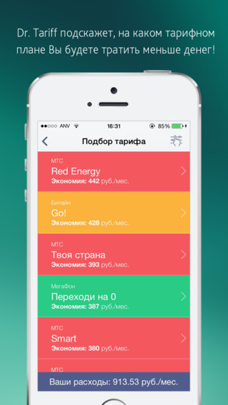 Dr. Tariff бесплатно подберет Вам оптимальный тариф. Мы изучим статистику Ваших разговоров, смс и интернет-трафика. И скажем, на каком тарифном плане Вы будете тратить меньше денег. В среднем, Вы начнете экономить по 400 рублей в месяц.