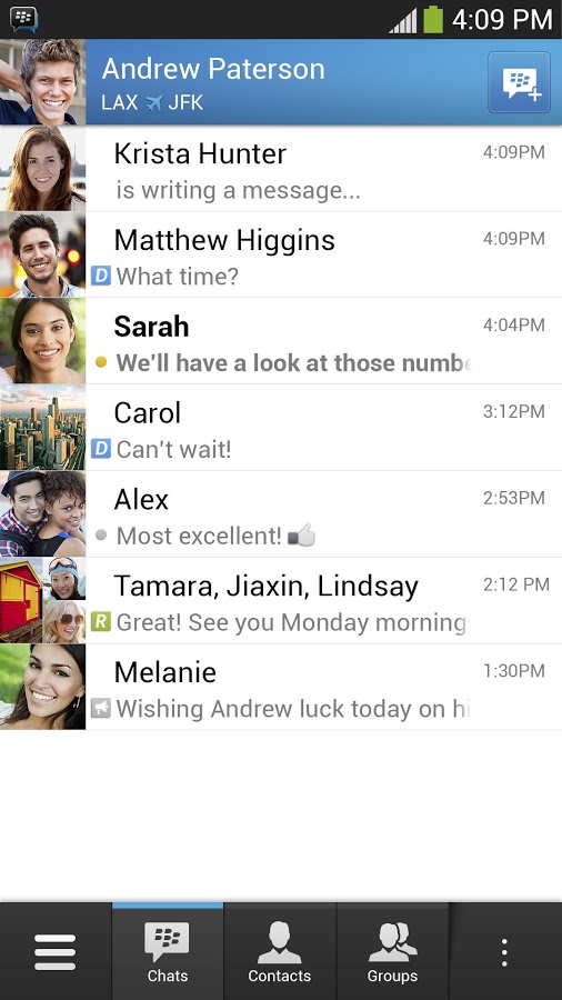 • Группы: группы BBM позволяют вам обмениваться фотографиями, списками и запланированными мероприятиями со всеми участниками группы. Вы также можете присоединяться к группе пользователей, которые не входят в ваш список контактов BBM.