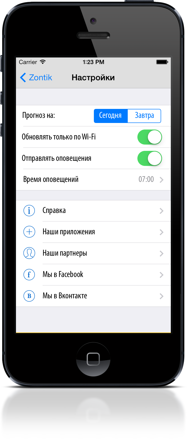 Можно настроить показ прогноза дождя на сегодняшний или завтрашний день. Приложение автоматически определяет ваше местоположение и показывает самый актуальный прогноз. Также можно обновлять данные используя только wi-fi соединение.