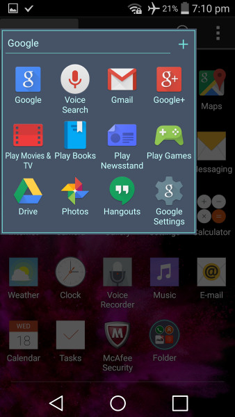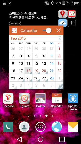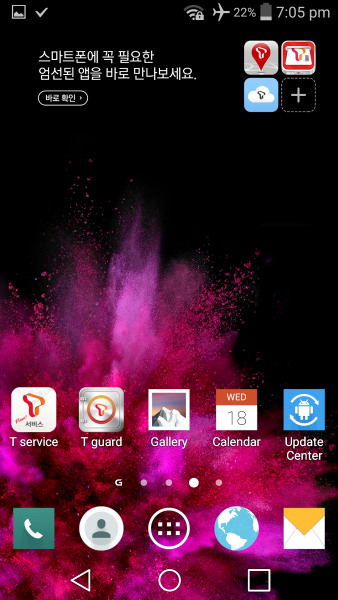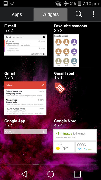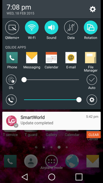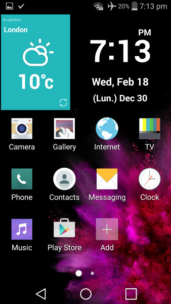 Разобравшись с экраном блокировки, Вы оказываетесь на довольно знакомом рабочем столе Android. Как и большинство дроидов, смартфон может иметь несколько рабочих столов, на которых будут располагаться ярлыки, виджеты и папки. Как в G3, кнопки навигации являются виртуальными. Кнопки на экране обеспечивают лучшее время отклика, тем более они не изнашиваются, но в то же время часть Вашего экрана большее время остается недвижимой.