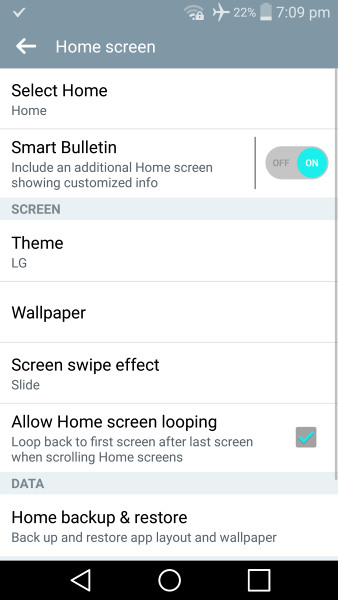 Левый рабочий стол зарезервирован для Smart Bulletin. Это сервис, чем-то похожий на HTC BlinkFeed и Samsung My Magazine. Smart Bulletin содержит информацию, которую передает приложение LG Health и смарт-советы, которые дают некоторую информацию о технологии и использовании телефона.