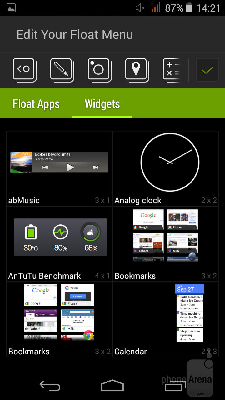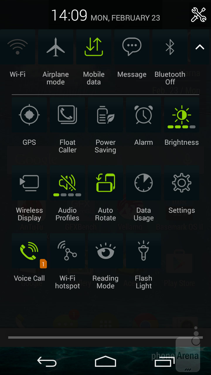 В интерфейсе Liquid Jade S нет никаких излишеств, но он практичный и функциональный. В меню приложений Вы найдете две страницы с настройками ярлыков мини-приложений. В особенности нам понравился виджет, который совмещает в себе ярлыки других мини-приложений.