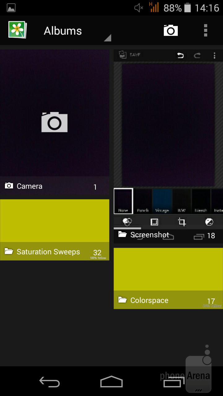 Приложение камеры Acer можно назвать всеобъемлющим. Оно содержит разнообразные эффекты, фильтры и режимы в хорошо организованном интерфейсе. Auto, HDR и панораму оставим в стороне, о них и так все понятно. В набор режимов входят «Красивое лицо», «Лучший снимок», «Bright Magic» (чтобы сделать яркие фото в условиях с низкой освещенностью), снимок с улыбкой (улыбайтесь и телефон сделает снимок), снимок со звуком, панорама на 180 градусов, режим презентации, двойной снимок (фото делается одновременно фронтальной и основной камерой) и режим изысканный (для фото, которые Вы собираетесь отправить в Instagram). Кроме того, приложение камеры позволяет настраивать яркость, контрастность, оттенок и насыщенность перед тем, как сделать снимок. Есть также четыре графических фильтра, а другими вариантами для редактирования фото Вы можете воспользоваться в Android галерее.