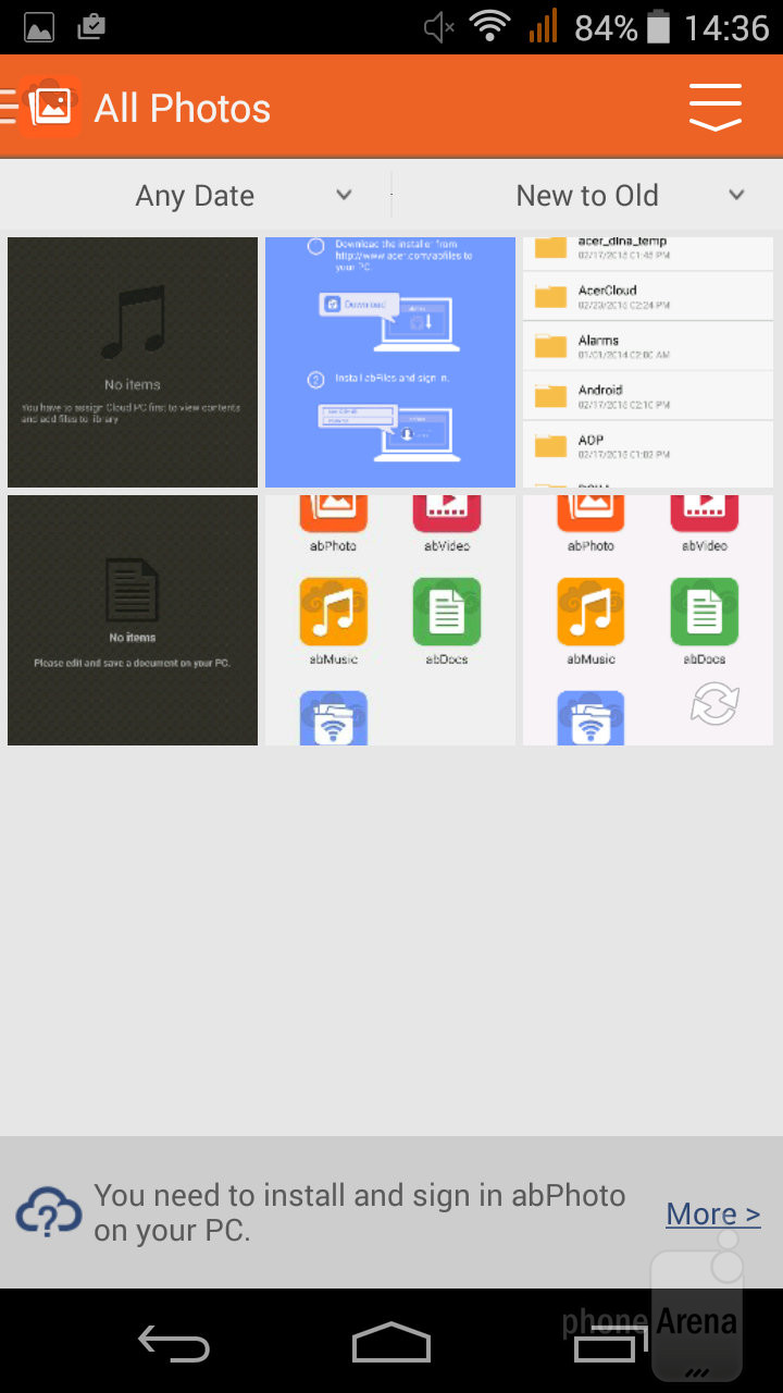 Еще одним интересным приложением является Acer Portal, который содержит набор 'abPhoto', 'abVideo', 'abMusic', 'abDocs' и 'abFiles'. Эти приложения интегрированы с сервисом Acer "Bring Your Own Cloud", что позволит Вам синхронизировать рабочие и мультимедийные файлы между смартфоном и ПК.