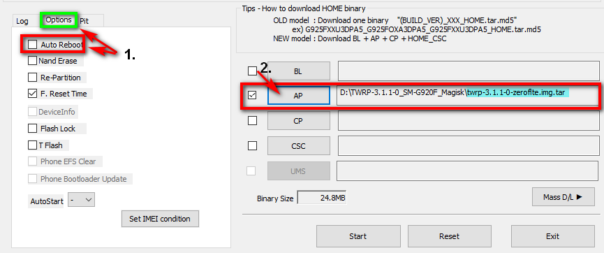 3. Запустить Odin3 v3.12.7.exe. Открыть вкладку Options и снять галочку с "Auto Reboot". Затем нажать кнопку "AP" и выбрать файл twrp-3.1.1-0-zeroflte.img.tarНа выключенном устройстве зажимаем и удерживаем три кнопки: Звук вниз + Домой + Питание. Удерживаем данную комбинацию пока не появится предупреждение о входе в режим Download Mode, для подтверждения входа в данный режим, нажимаем кнопку увеличения звука. После входа в режим Download на экране будет отображаться Downloading... do not turn off target !!