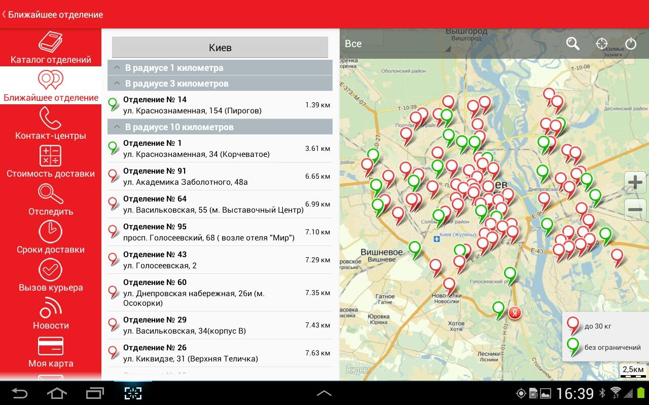 - быстрый поиск – поможет найти адрес любого отделения на территории Украины, а также выбрать отделение, ближайшее к Вашему текущему местоположению в радиусе 1 км, 3 км или 10 км;