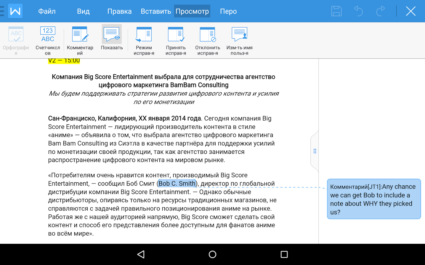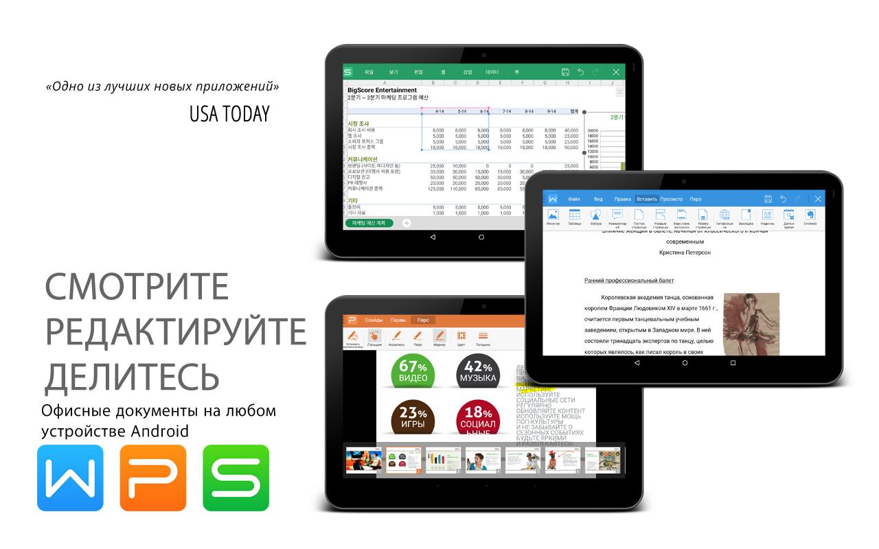 WPS Office может открыть почти любой документ, включая PDF, TXT, а также Microsoft Word, PowerPoint и Excel. Документ, полученный по эл. почте или загруженный из облачного сервиса, в WPS Office будет выглядеть именно так, как выглядел бы на ПК. В WPS Office предусмотрены функции, аналогичные функциям офисного решения для ПК, в том числе продвинутое форматирование текста и параграфов, а также добавление и редактирование в презентациях или документах изображений, фигур, таблиц и диаграмм. WPS Office позволяет обмениваться файлами с помощью эл. почты и Evernote, а также пересылать их по WI-FI или DLNA. С помощью WPS Office можно просматривать и редактировать документы, загруженные из облачного хранилища. После завершения редактирования WPS Office автоматически сохранит их онлайн.